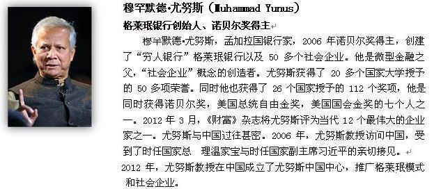穆罕默德•尤努斯,孟加拉国银行家,2006年诺贝尔奖得主,创建了“穷人银行”格莱珉银行以及50多个社会企业。他是微型金融之父,“社会企业”概念的创造者。2012年3月,《财富》杂志将尤努斯教授评为当代12个最伟大的企业家之一。