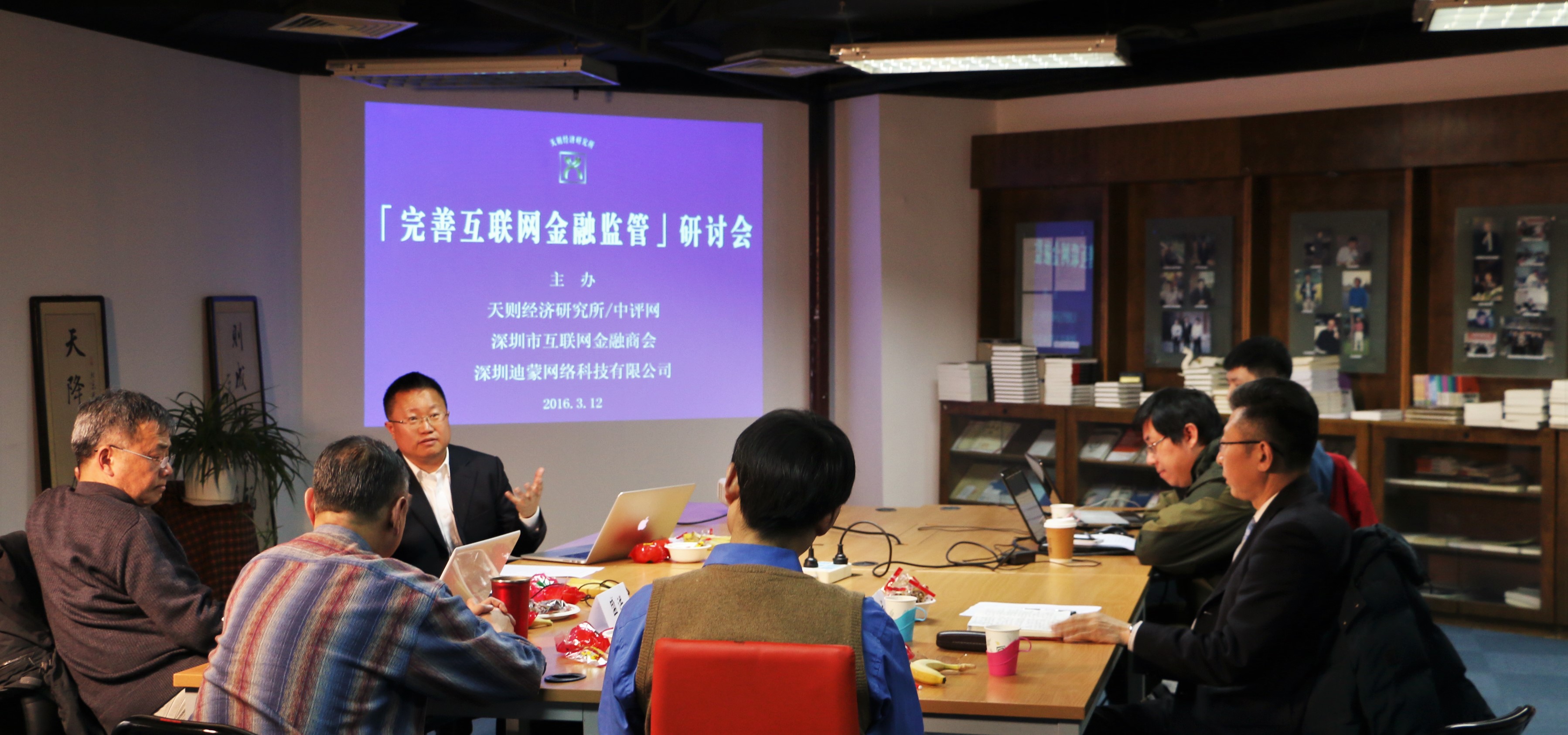 2016年3月12日,天则经济研究所、中评网、深圳市互联网金融商会、深圳市迪蒙网络科技有限公司联合主办的“完善互联网金融监管”研讨会在天则所内召开。天则经济研究所所长、山东大学经济研究院教授盛洪,中国人民大学教授、公共政策研究院执行院长毛寿龙,北京中永律师事务所合伙人、财经评论员刘兴成律师等专家学者出席会议参与讨论。天则经济研究所法治与公共治理研究中心主任蒋豪先生主持会议。深圳市互联网金融商会会长向隽先生向会议提交了书面发言。